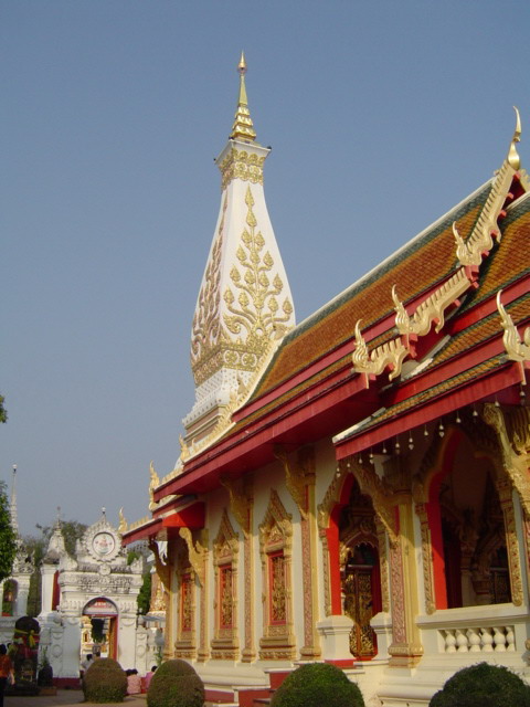 In 1975 the tower which surmounts the reliquary collapsed after several days of heavy rains since the structure has become progressive weaker over the centuries. The Breastbone Relic of Buddha and other precious objects were found within the reliquary. It was reconstructed in 1977 and completed in 1979. It soars to height of 57 meters. Aroyal ceremony was performed for the installation of the five-teired gold umbrella, weighing about 16 kilograms, Which adoms the top of the That, and to re-enshrine the Breastbone Relic of Buddha and other precious objects within. His Majesty,King Bhumibol, the ninth King of Chakri Dynasty, and the Supreme Patriarch of Thailand came to preside over the ceremony on 23 March 1979. The great annual festival is held in late January or early February in the third luna month. On very special occassion, the villagers come to pay respect to Prathatphanom shrine with their annually harvested corps. Buddhists in neighboring countries also revere this site and appreciate any opportunity to visit.